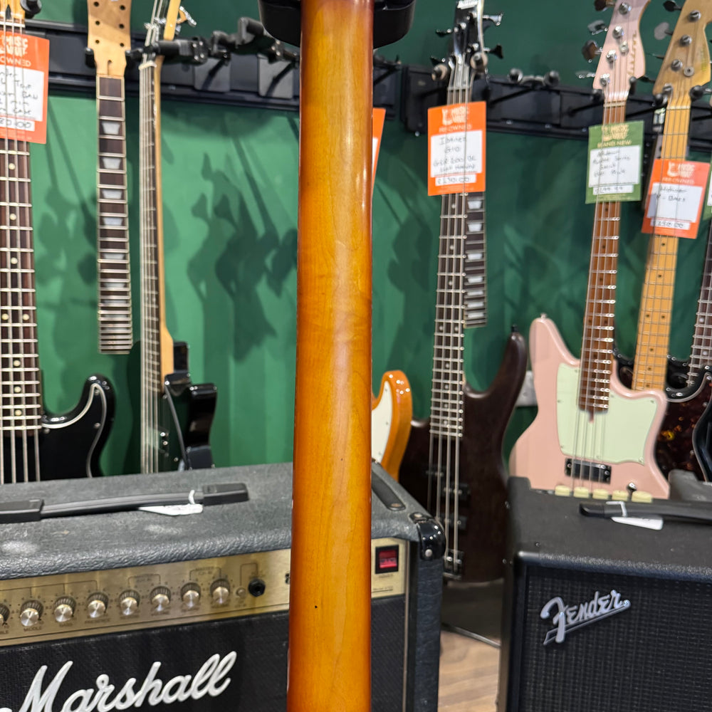 This is a Hofner-style violin bass, made as a replica of the classic model famously used by Paul McCartney. It delivers the look and vintage feel of the original, with a lightweight hollow body and short scale length that make it comfortable to play. While not an authentic Hofner, it still provides warm, woody tones and a distinctive style that stands out on stage.