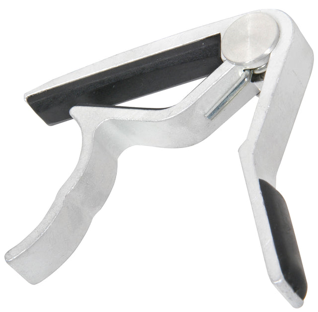 Metal capo with easy to fit spring loaded mechanism. Ideal for acoustic or electric guitars.