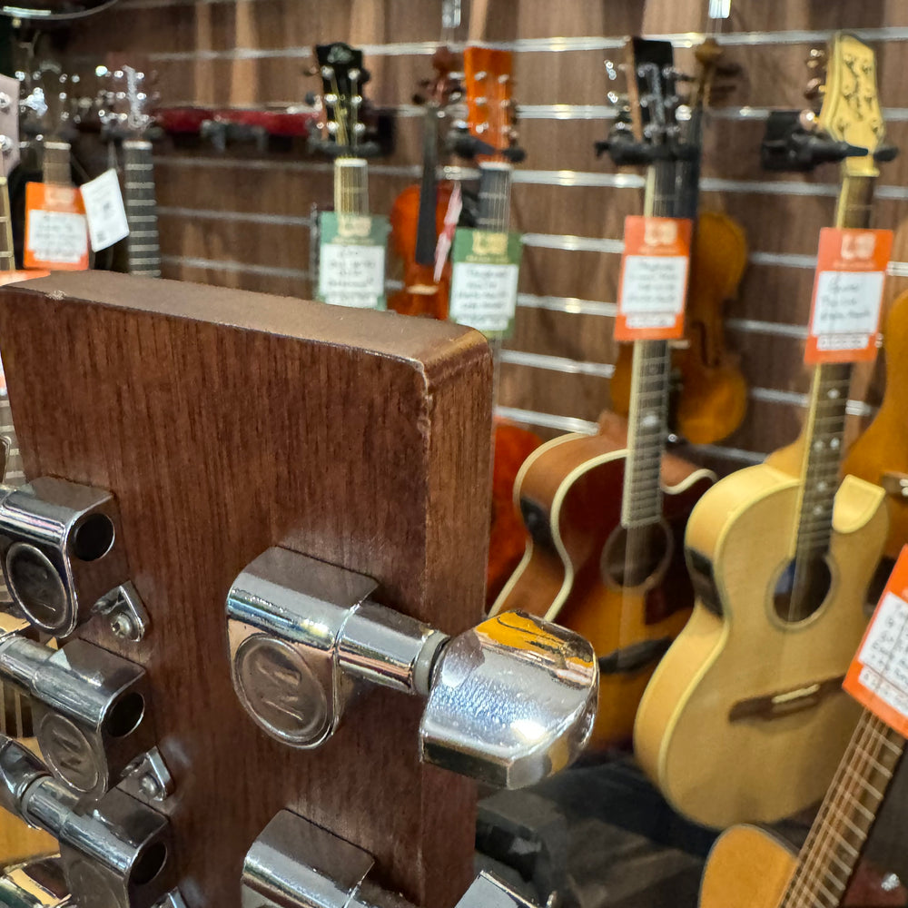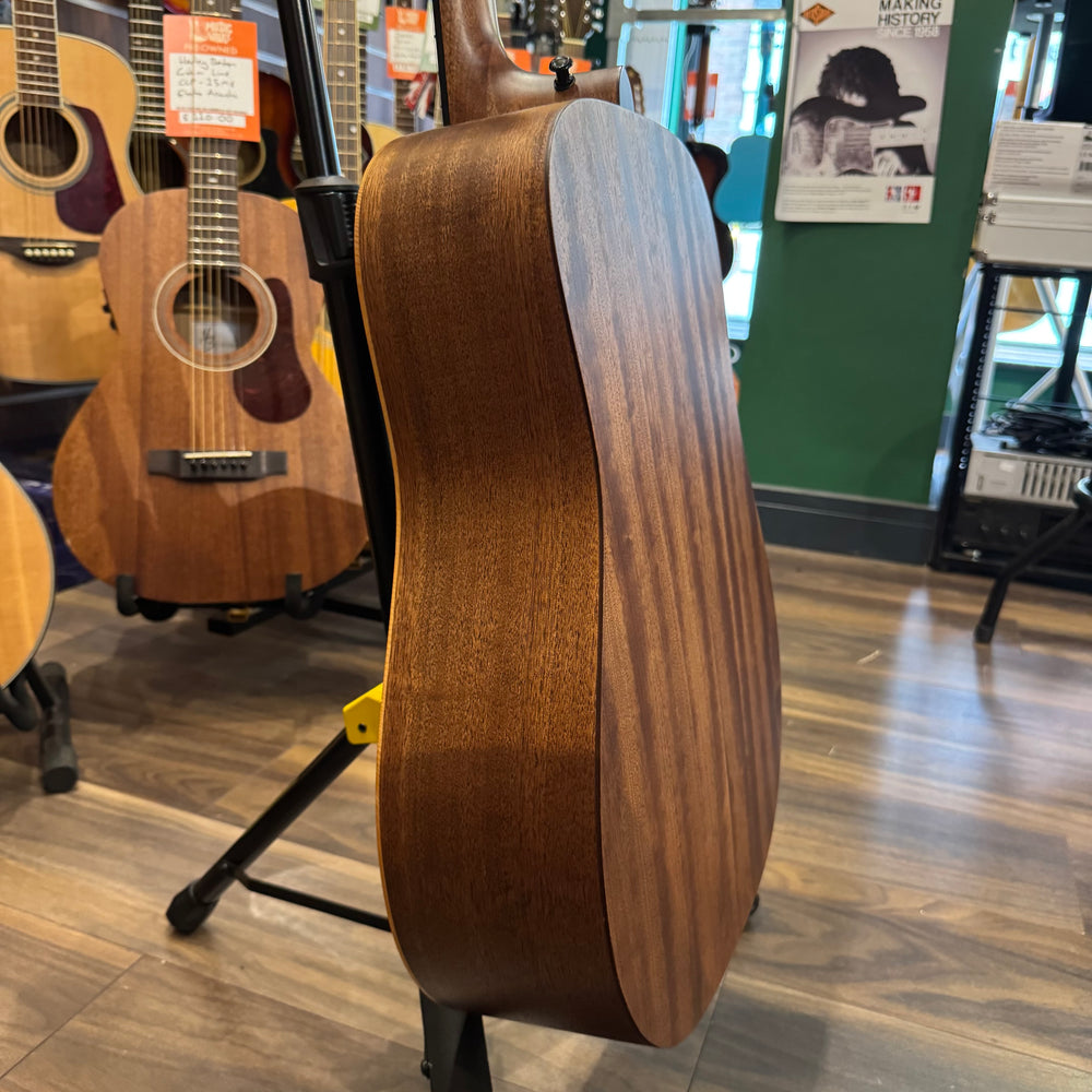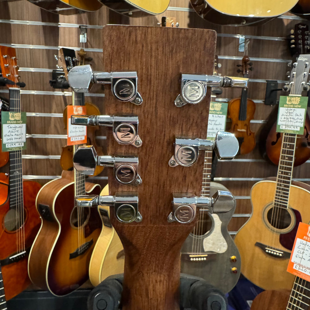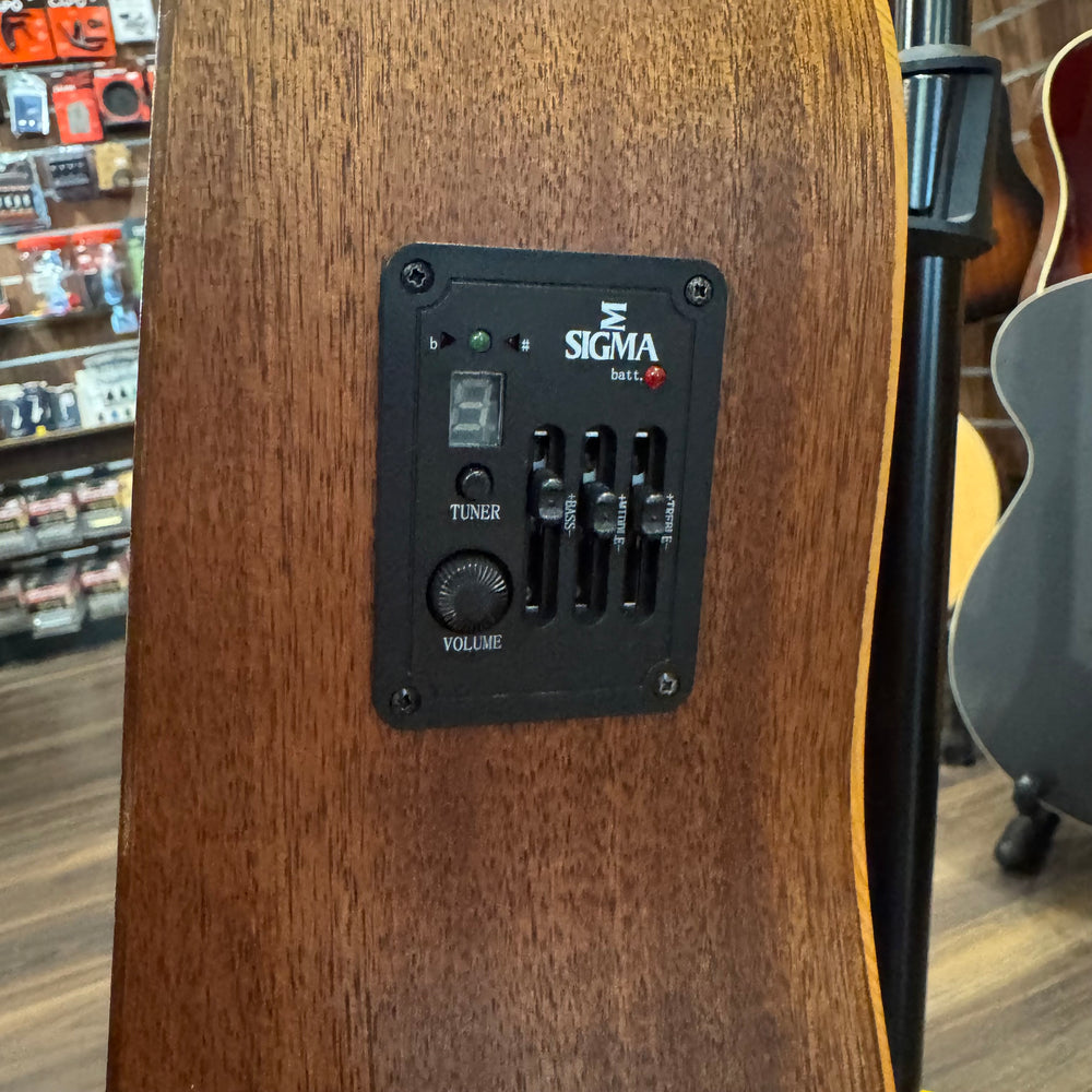 The Sigma DM7E is a full body dreadnought acoustic guitar with a trick up its sleeve! An additional paired G String - tuned an octave up from the normal G string - adds a beautiful shimmer without the need to go for a full 12-string guitar. It's much easier on the fingers too! It features a solid Sitka Spruce top paired with Mahogany back and sides. What's more, the DM7E is fitted with a bone nut and saddle. This gives this guitar a superb acoustic tone that will quite easily shame bigger brands costing several times as much. It's bright and airy with plenty of body and detail. The Sigma DM7E doesn't just stop there. Fitted to the side of the body is an active Sigma preamp with volume, bass, middle and treble controls along with a chromatic guitar tuner.