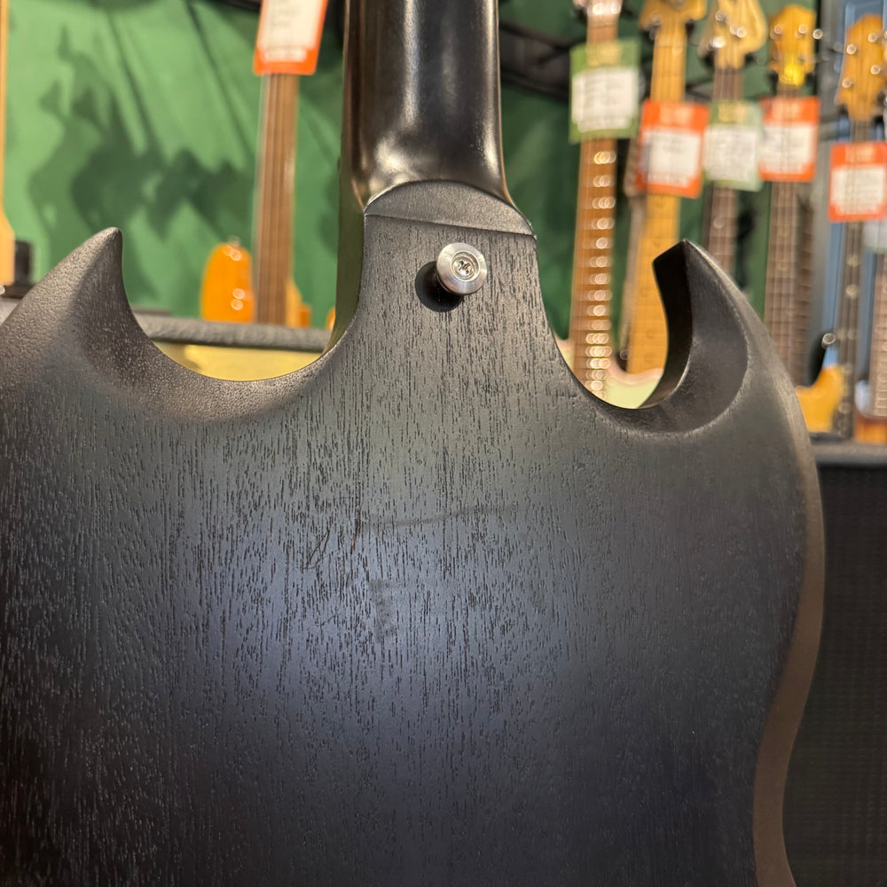 With the Gibson SG Faded Tribute Worn Ebony electric guitar, the guitar giant is launching a straightforward interpretation of the legendary double-horned SG, which turns out to be the secret weapon for first-class rock sounds. Besides the slim mahogany body, Gibson uses a set maple neck with a rosewood fretboard, on which every riff or solo plays almost by itself thanks to the "Rounded" profile. With two Gibson 490 Alnico II humbuckers, the Gibson SG Faded Tribute also delivers first-class blues and rock sounds with lively dynamics and a warm mid-range spectrum that cannot deny its relationship to the legendary PAFs of the 1950s. A classic hardware configuration with stop-bar tailpiece, Tune-O-Matic bridge and vintage keystone machine heads completes the Gibson SG Faded Tribute Worn Ebony.