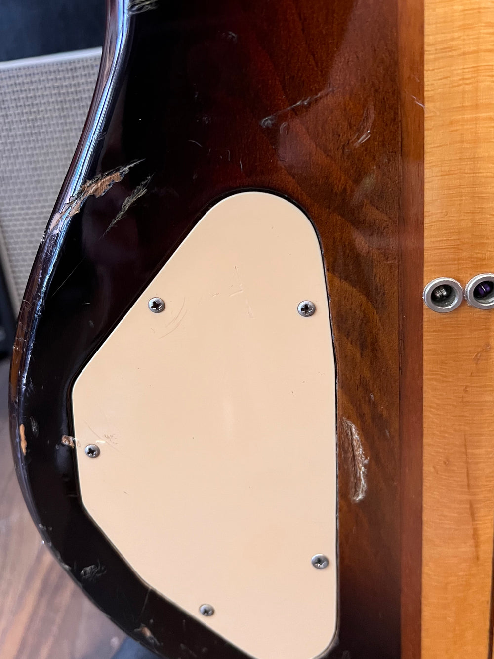 The 1980 Aria Pro II TS-500 is a Japanese-made set-neck electric guitar built by Matsumoku. It features a laminated ash/walnut/maple body and a three-piece maple neck with a rosewood fingerboard. Equipped with dual Extra III (Protomatic III) humbuckers, the TS-500 offers a wide array of tonal options through its Tri-Sound electronics: independent coil-tap switches, a phase switch, a 6-position rotary tone selector, and an active booster.